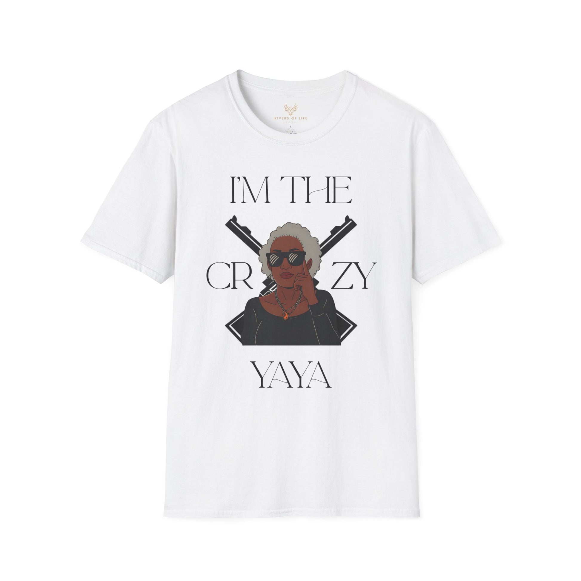 This lightweight crew-neck tee brings bold personality into everyday wear. Soft, ring-spun cotton and a classic fit make it comfortable enough to reach for on busy mornings and cool evenings alike. The front features a stylized illustration of a fierce, silver‑haired grandmother figure with sunglasses and crossed shotguns behind her, framed by the playful phrase "I'M THE CRAZY YAYA" in an elegant, high-contrast type. The result is a confident, tongue-in-cheek statement piece that reads like a wink — for those who love humor with edge and want clothing that speaks with attitude without shouting. Durable construction, tear-away label, and ethical cotton sourcing keep this shirt feeling as good as it looks over time.