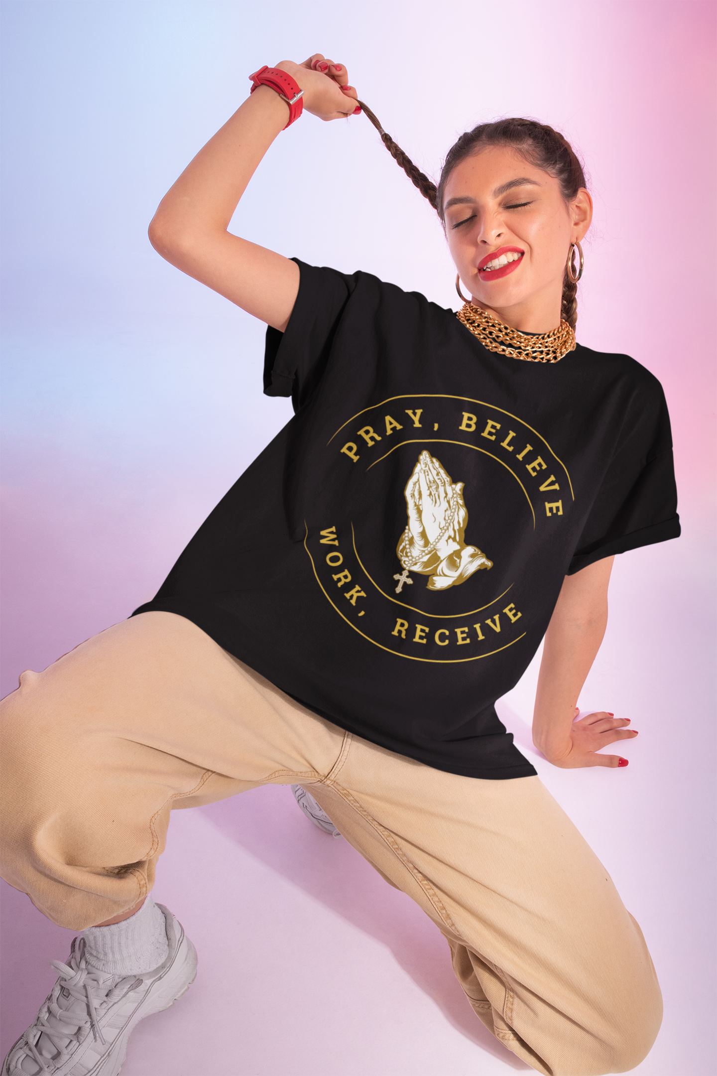 This T-Shirt features an inspiring message 'Pray, Believe, Work, Receive' printed on durable, smooth fabric, perfect for daily wear. The classic fit and versatile style make it suitable for adults looking for a comfortable yet meaningful addition to their wardrobe. Ideal for religious holidays and everyday motivation.