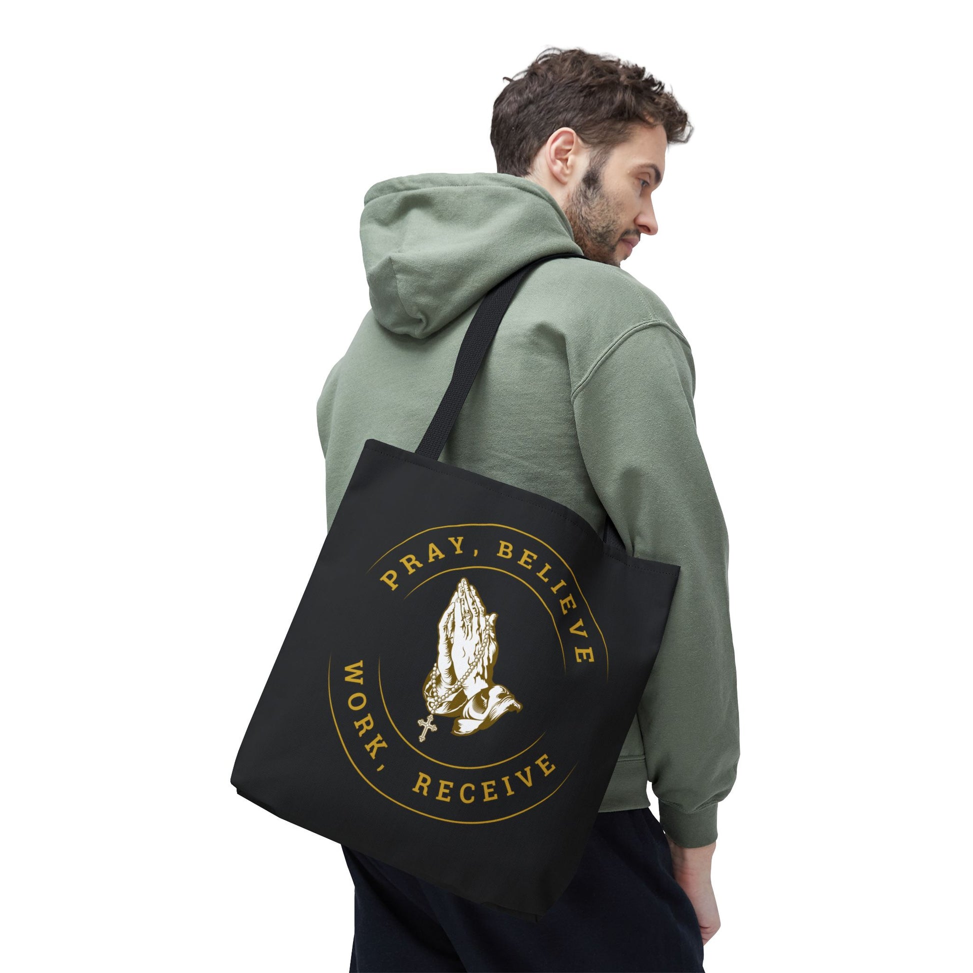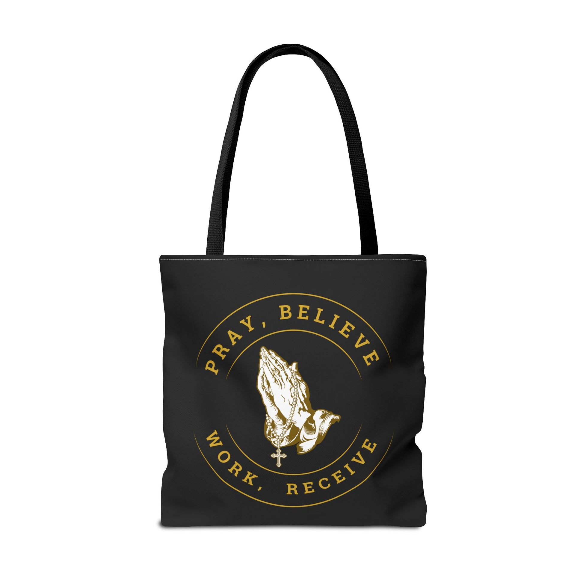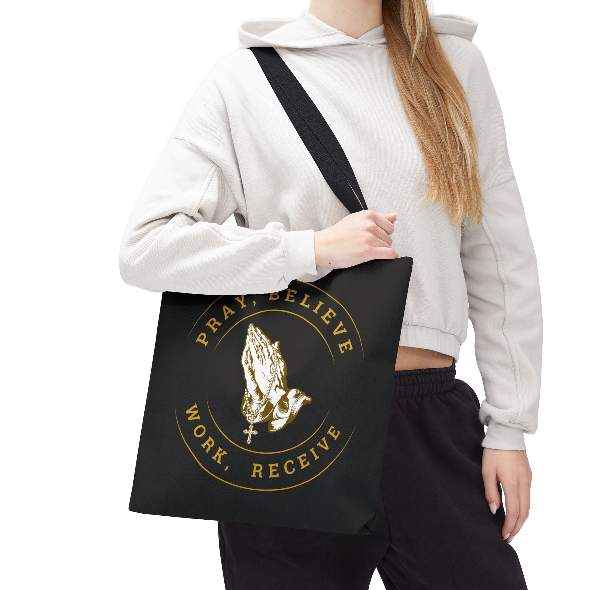 This Pray, Believe, Work, Receive Tote Bag is a durable and stylish accessory that provides motivation and positivity to your daily life. It's perfect for carrying groceries, books, and essentials, making it a practical and inspirational item for students, teachers, and busy individuals. Ideal for religious holidays and spiritual occasions.